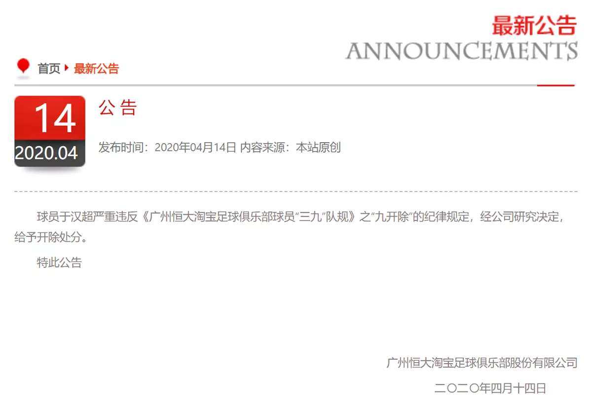 紧接着,于某所在的恒大淘宝足球俱乐部也因为他这次的违法行为予以开除处分,给出的缘由是违反了队内的“三九”队规。