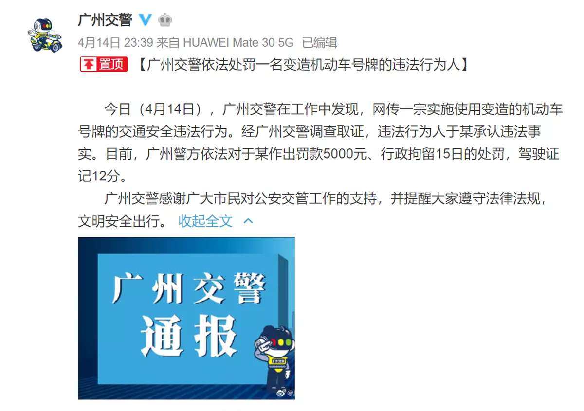 4月14日,有网友爆料于某街头涂改车牌,这件事情在网络上迅速发酵。就在当天,当地的广州交警迅速跟进。没多久,调查结果就出来了。