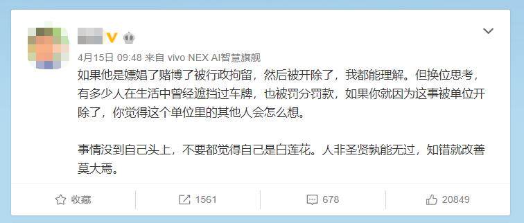 同为业界的足球国脚引用了非常有名一句话,“人非圣贤,孰能无过”,认为网络上的网友批评是落井下石。而在足球体育圈中颇有名气的记者同样认为,“知错能改,善莫大焉”。