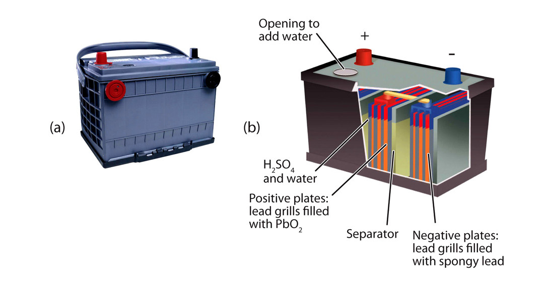 从结构上看,铅酸蓄电池里面有6个独立的单元,每个单元里有多个正负极板,正负极板之间有一层透水隔板,将电池内部分为几个独立的“小房间”,所有的这些东西都浸泡在由65%的水和35%的硫酸组成的电解质溶液中,负极板会和电解质溶液发生反应,释放电子;