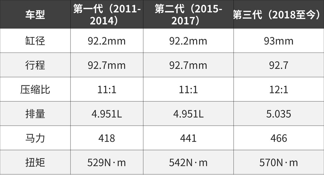 我们先从参数说起,这是一台5.0L自然吸气发动机,气缸夹角为90度,在7000rpm时输出466匹马力,最大扭矩570N·m/4600rpm,红线转速7500rpm,对于一台十字曲轴的V8发动机来说,7500rpm已经是非常高的转速了;压缩比相比起上一代机型也有了提升,达到了12:1。