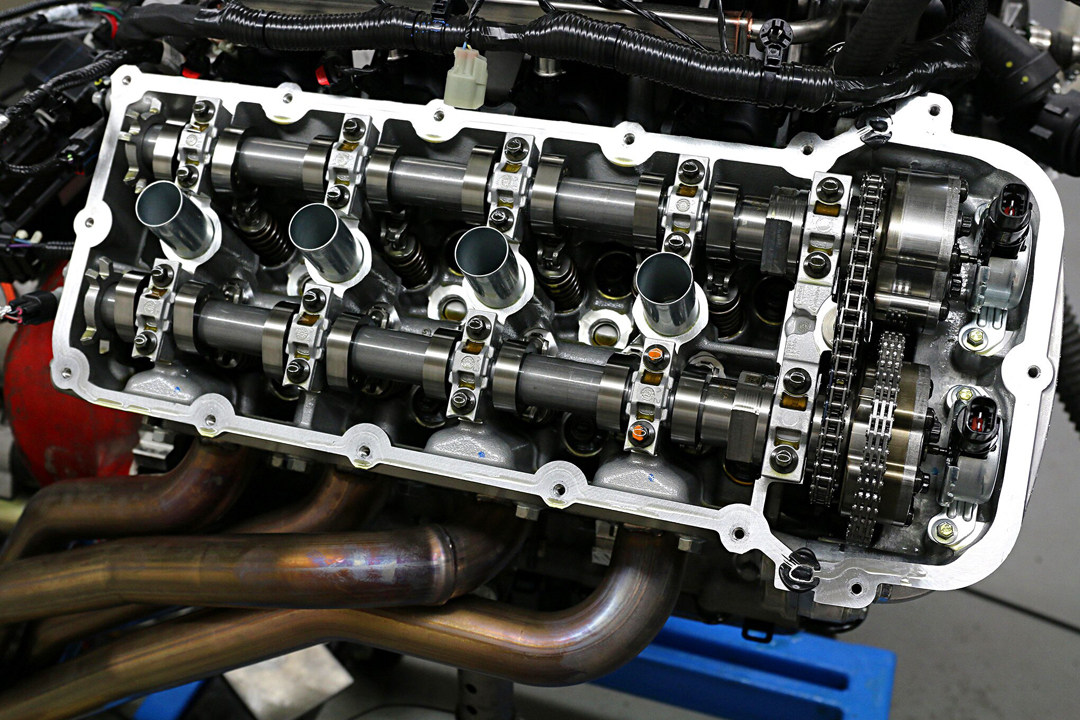 发动机缸体和缸头都是铝合金铸造,活塞也是铸造铝合金,连杆为烧结锻造,曲轴是锻造钢十字曲轴。配气机构使用双顶置凸轮轴设计(DOHC),每缸四气门,并搭配了双独立可变正时凸轮,所以进排气凸轮可以单独进行正时调节。