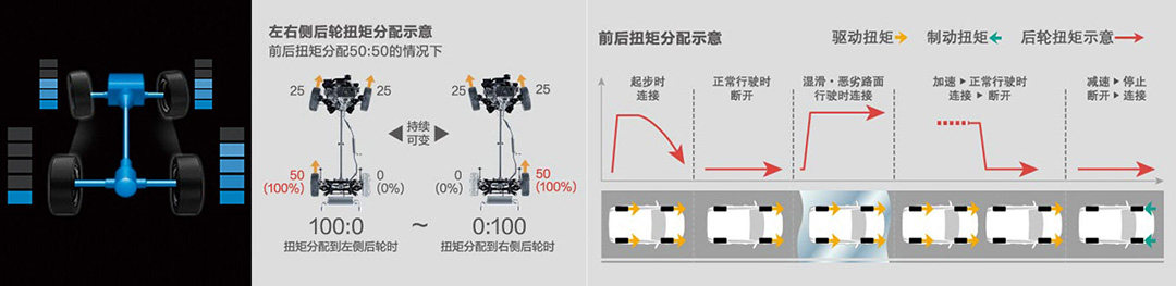 上面也提到了,DTC智能四驱其实算是个基本款,那么往上一级的DTV动态矢量四驱系统,自然就是性能更强的升级款。相比前者,该四驱系统除了可以实现前后轴动力按需分配外,还能够动态在100:0~0:100这个区间,按比例分配两个后轮的动力。