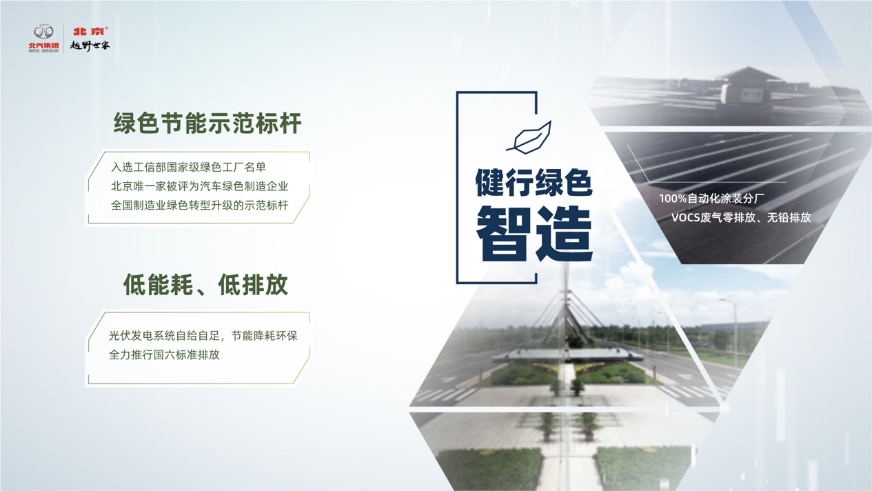 作为北京市唯一一家汽车绿色制造企业,北京越野依托于“最环保”的绿色智造工厂,从源头上实现绿色节能:光伏发电系统的深度应用,在保障资源健康可持续的基础上,实现了工厂动力能源的自给自足,构建成了一条全价值链的绿色环保体系。