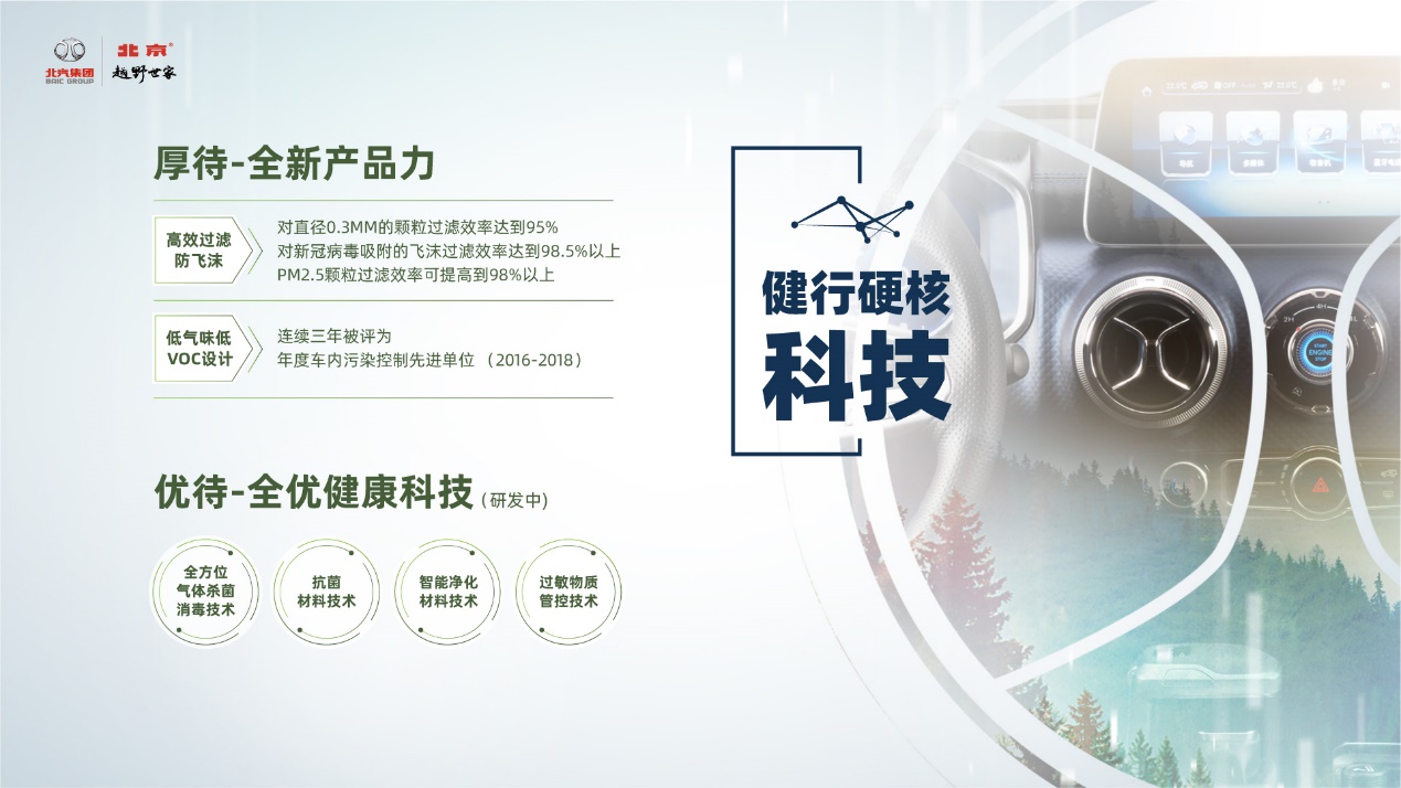 作为越野车领域第一个真正实现健康产品落地的企业,北京越野认为,真正的出行健康不仅包括驾驶安全,更应囊括车内环境健康以及精神层面的健康出行。全新的“健行方舟计划”涵盖了“健行趣野生活”、“健行绿色智造”“健行硬核科技” 和“健行贴心服务”四大产品体系,为消费者构建了一个更加完善的绿色出行保护圈。