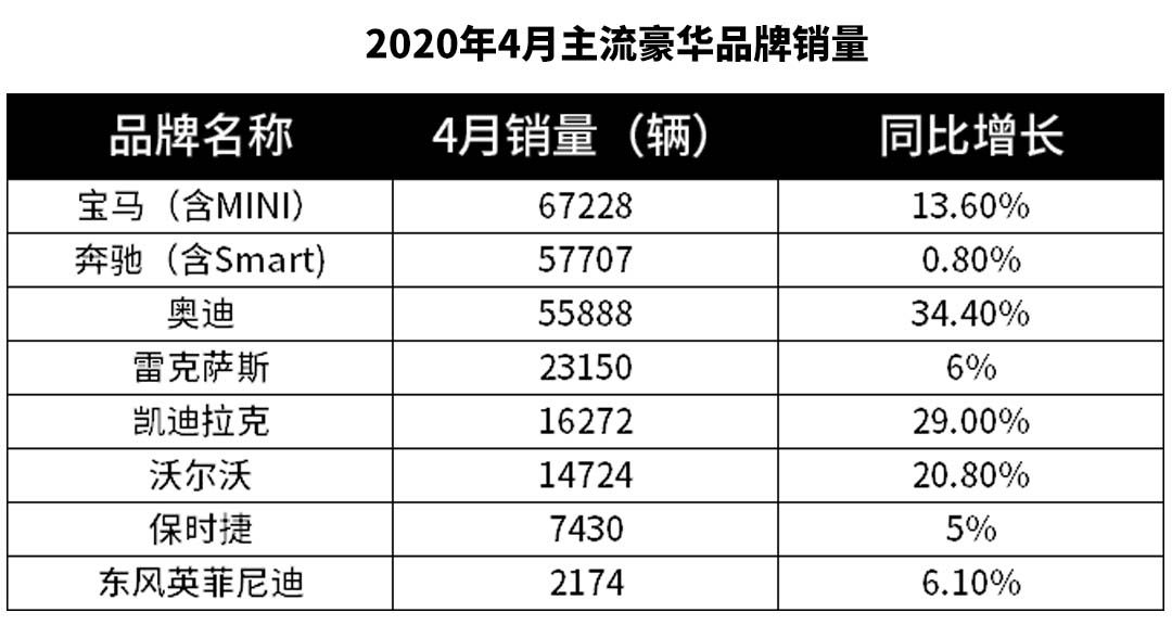 目前5月份的数据还未公布,我们从公开的数据来看,在4月份,宝马、奥迪、奔驰、沃尔沃、凯迪拉克等豪华品牌,出现了两位数以上的增幅,而奔驰、保时捷、雷克萨斯、英菲尼迪等品牌也保持着正增长。