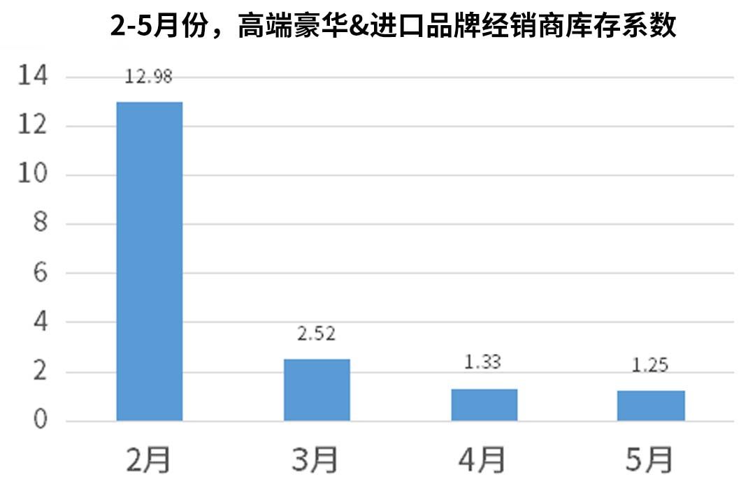 来自乘联会的数据显示,高端豪华&进口品牌经销商库存数从2月份的12.98下降到5月份的1.25,下降了90.3 %,库存系数降至警戒线以下。而随着库存的减少,经销商的优惠力度也有所回收。