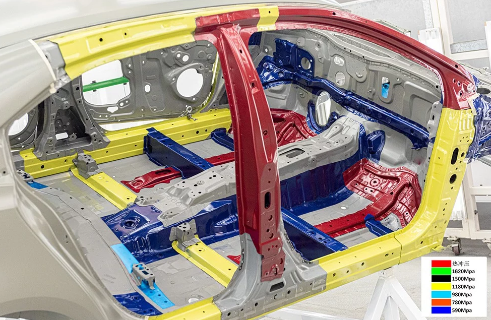 从雷凌的车身上可以看到丰田的车身设计很讲究,哪一个区域用什么材料,用多少都算的明明白白。前立柱用强度为1180Mpa的钢材,A柱和B柱用热冲压钢材,在凯美瑞上这两个部位钢材强度是1500Mpa。