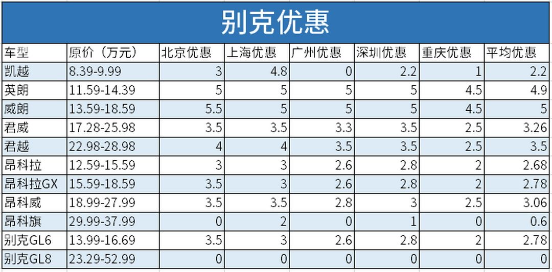 其他车型方面,别克的车型大概也有2.5-3.5万元的优惠,优惠完后各个车型的性价比相当不错,尤其是考虑到别克的车型在隔音和内饰的水准都达到豪华车的水准。
