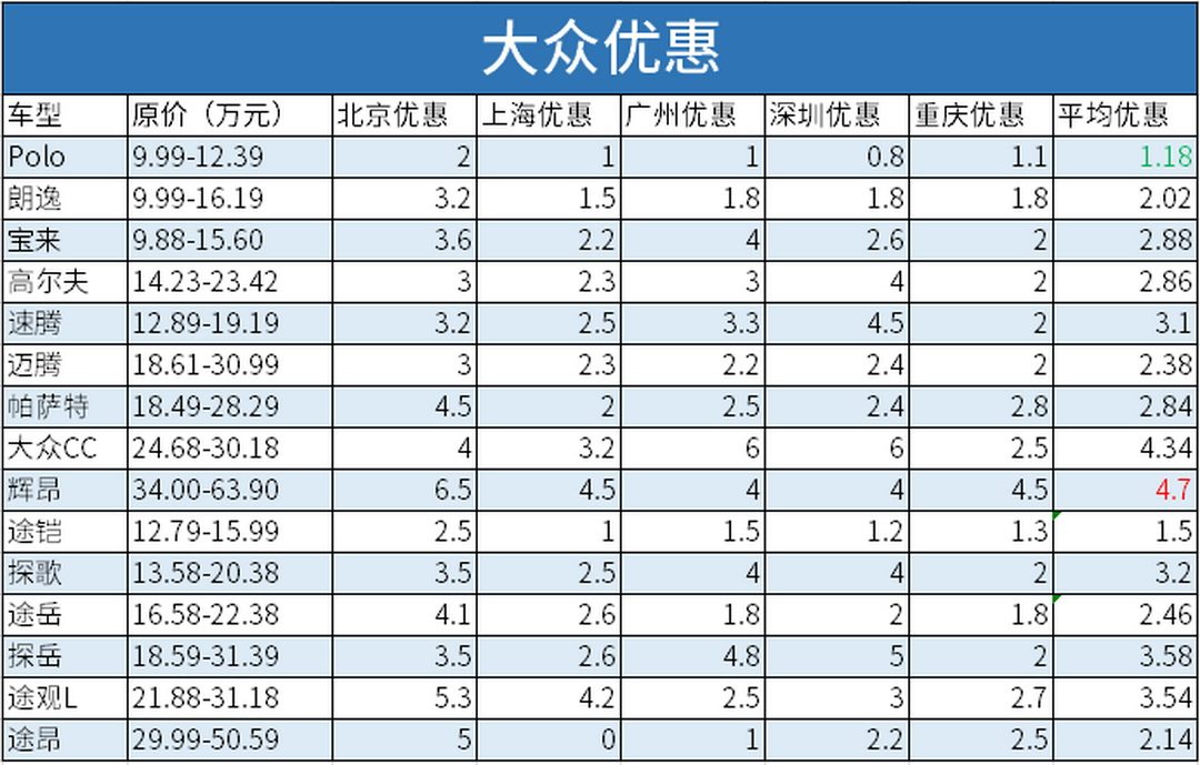 大众的车型优惠属于中规中矩的样子,折扣大概是8-9折之间。