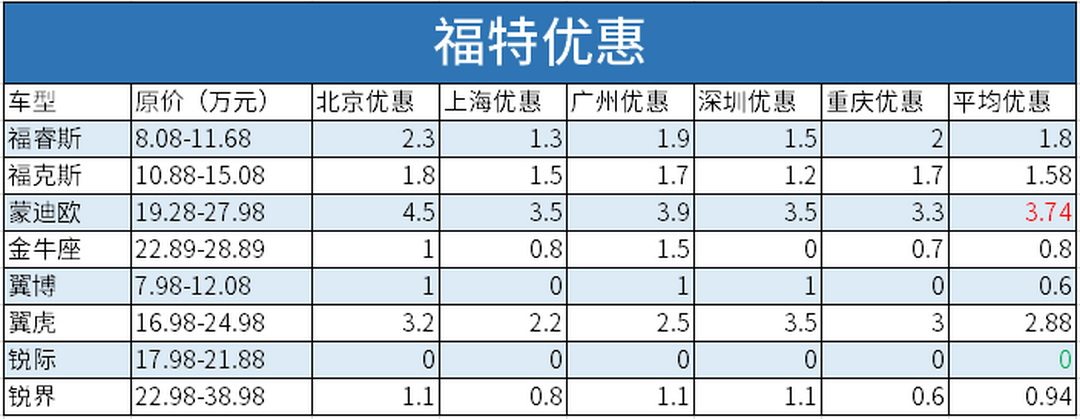 福睿斯和福克斯的优惠都比较大,这两款车都是三缸车型,但是比起别克的差不多价格对半的优惠,福特对自己下手还不够狠。