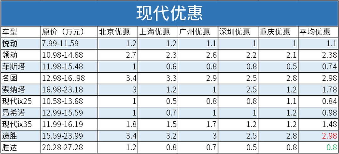 我原以为,现代的优惠会挺大的,没想到优惠幅度挺一般,平均下来跟福特差不多。