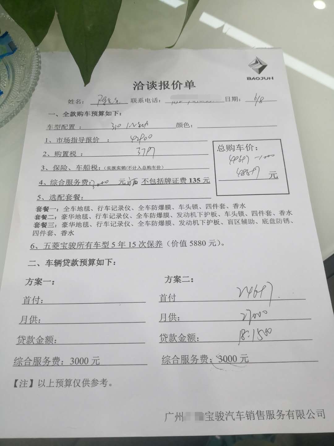 关于落地:经过询问得知,宝骏310的优惠为1000元,相对于其他车型来讲是比较少的。其中,如果全款落地的话,落地价为48697元,里面包括3000元的综合服务费、3797元的购置税以及优惠了1000元之后的裸车价。值得一提的是,保险并没有在这些价格之中,经销售解释,保险不会强制在店内购买,看个人选择,想怎么买就怎么买;在贷款方面,贷款27000元,分18期,月供为1500元,为何要分18期呢?因为18期免息是它们的金融政策!不过,贷款还是需要3000元的服务费用的,这么低的车价,值不值得出这个钱还得看自己!