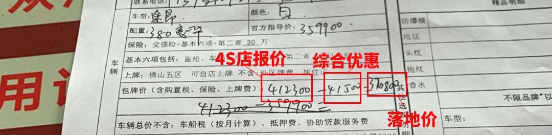 据销售人员介绍,目前店内购车综合优惠4.15万左右,但需在店内上牌、买保险。我们从销售提供的报价来看,店内的落地价去到了41.23万,而我们从汽车之家上面的报价来看,只要40.40万左右,多出了八千元左右。