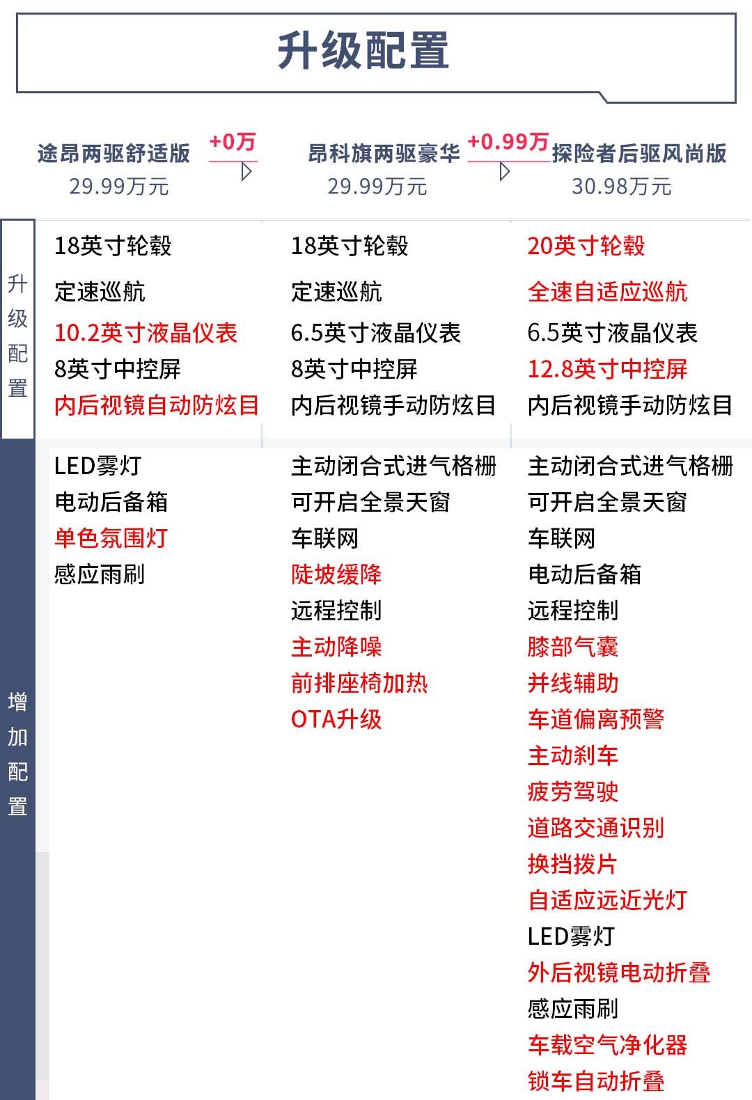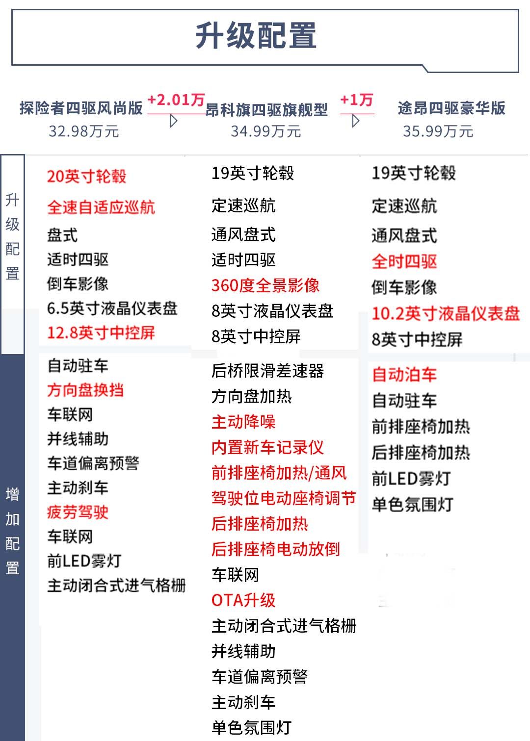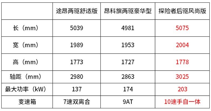 而在四驱版本中,探险者同样拥有着两驱版本的高性价比。经过我们的一番对比发现,售价32.98万的探险者四驱风尚版和售价34.99万的昂科旗四驱旗舰型以及售价35.99万的途昂四驱豪华版在配置上较为接近。
