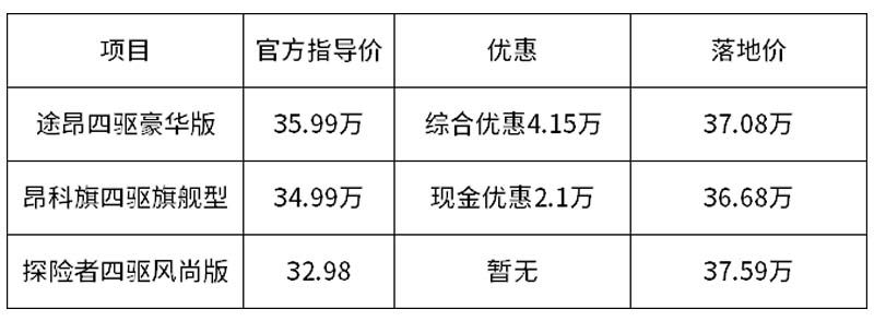 目前探险者暂无优惠,购车需店内上牌、买保险,落地价37.59万左右。新车虽然没有优惠,但店内赠送3年6次机油+机滤的基础保养。如果贷款购车,还提供12万元零利息政策。