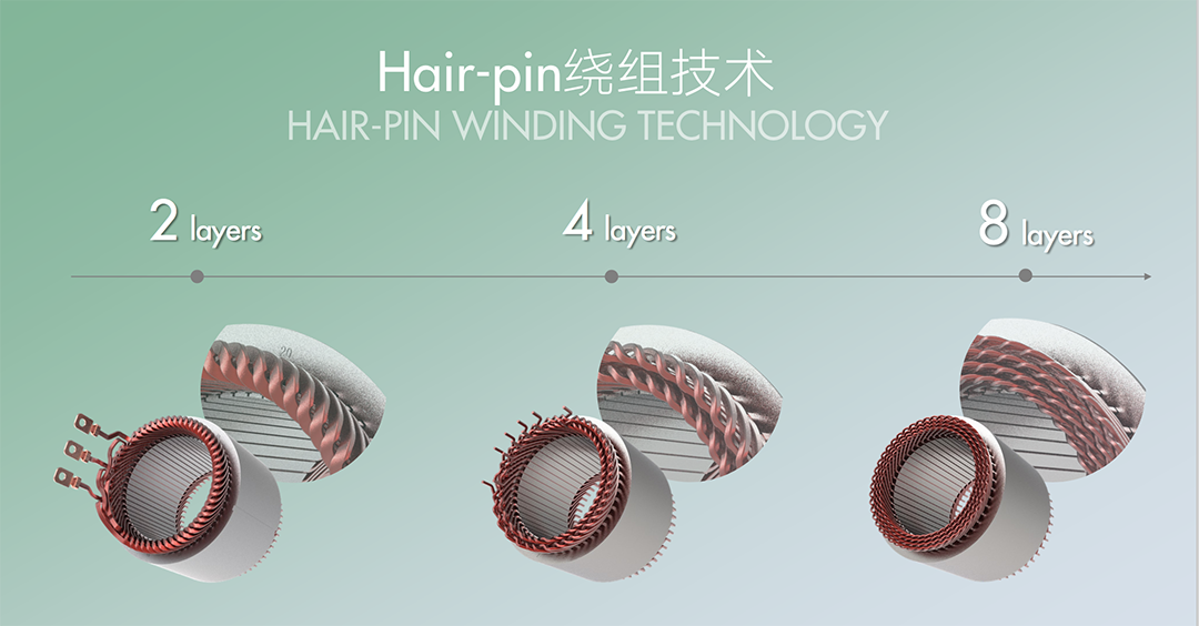 相比起一般的Hair-pin扁线绕组为2层一组上下两组4层排布,8层Hair-pin绕组技术让“趋肤效应”减弱,让铜线周围和中间截面面积通过的电流实现更好的平衡跟利用,减小周围电流过大和发热更明显的问题。