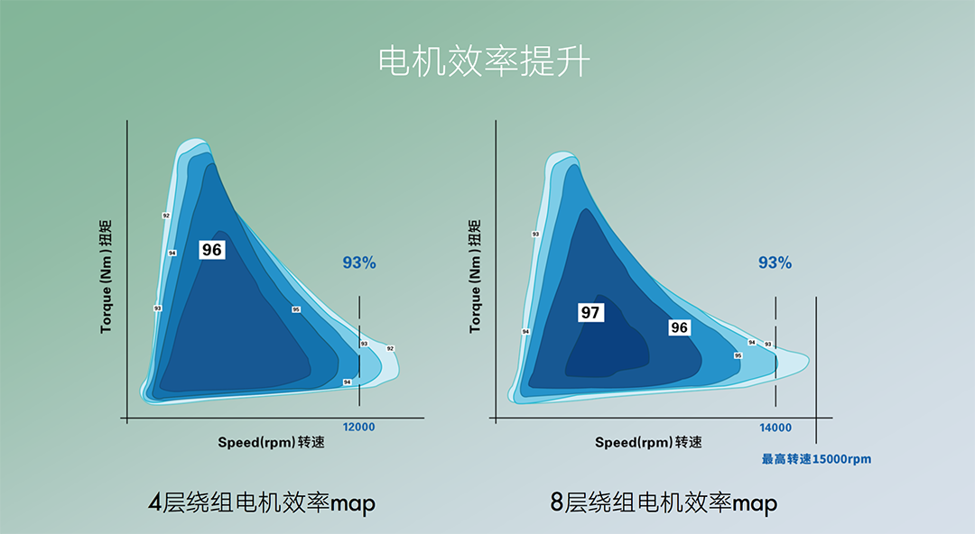 8层Hair-pin与4层Hair-pin绕组电机相比,可将电机效率保持在≥90%的工作区间从83%提升至88%,并在优化了电机冷却系统、转子拓扑等之后,从而将电机的功率密度提升53%,接近6kW/kg,扭矩密度提升12%,接近12N·m/kg。