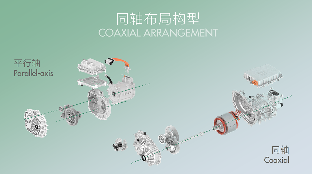 把输出轴、半轴、电机轴放置在同一轴线上,配合电机总成更小的体积优势,实现纵向和横向空间的优化,可将电机仓做得更加紧凑,为车内腾出更多的乘坐空间,也可以进一步压缩车辆的高度,这是同轴布局结构比平行轴布局结构的电动车更有优势的地方。