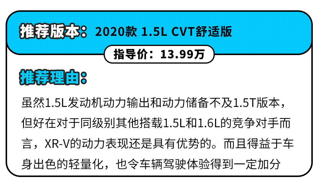 在去年7月经历了中期改款后,XR-V在动力和内饰质感上有了很大提升,首先老旧的1.8L发动机被替换为了思域同款的1.5T发动机,而内饰中大面积软质材料的包裹也提升了车内质感表现,同时也针对一些功能性配置进行了下放。不过在产品定价上来说,新出的1.5T版本可真是不便宜,指导价在14.59-17.59万,而且入门版车型上连LED大灯、天窗等时下流行配置都并不涵盖,总体而言可买性不强,但花费17万甚至更高的车价对于年轻人而言也并不友好。