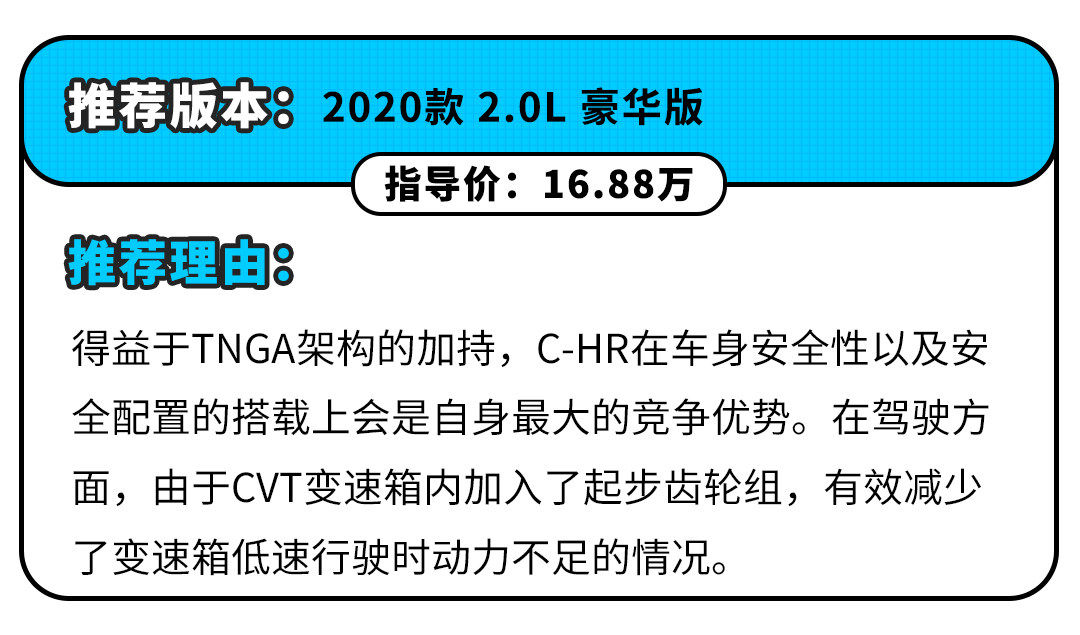 要说C-HR这个定价也确实够自信的,14万的起步门槛早已甩开同级别的不少竞争对手,不过要说产品亮点,C-HR的表现确实也对得起自身偏高的定价,首先丰田TNGA本就非常注重车辆安全方面的表现,高刚性GOA车身、全新设计的防撞梁以及全系标配的10安全气囊都为车辆的行驶安全性加分不少。同时2.0L发动机40%的热效率也极大程度降低了车辆的油耗表现,实测车辆的百公里综合油耗仅有6.5L。