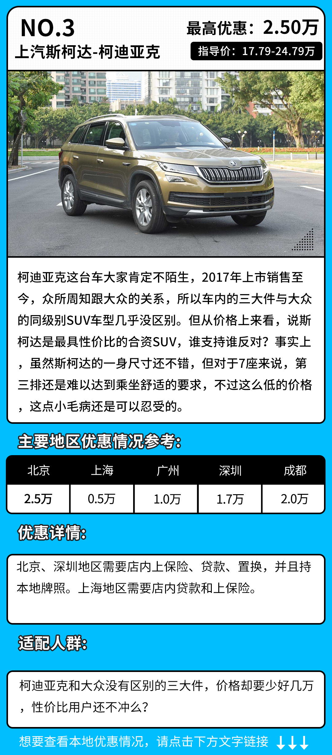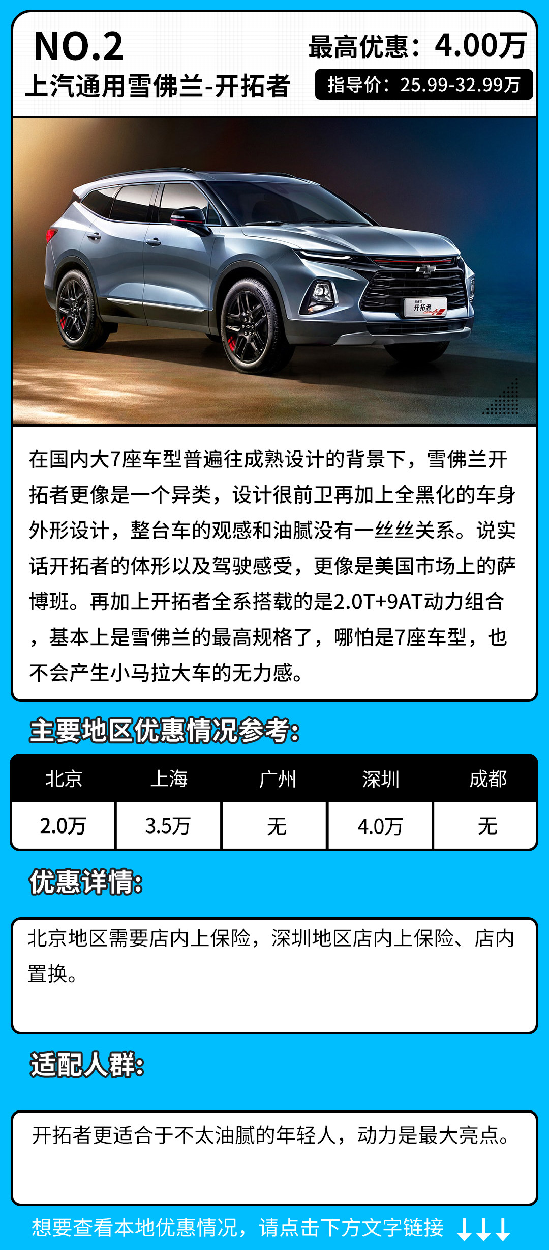 那么本期优惠行情栏目,买买君就带大家一起,来看看更新不久的各大车企大7座SUV优惠到底有多大,最值得选择的车型是哪款。