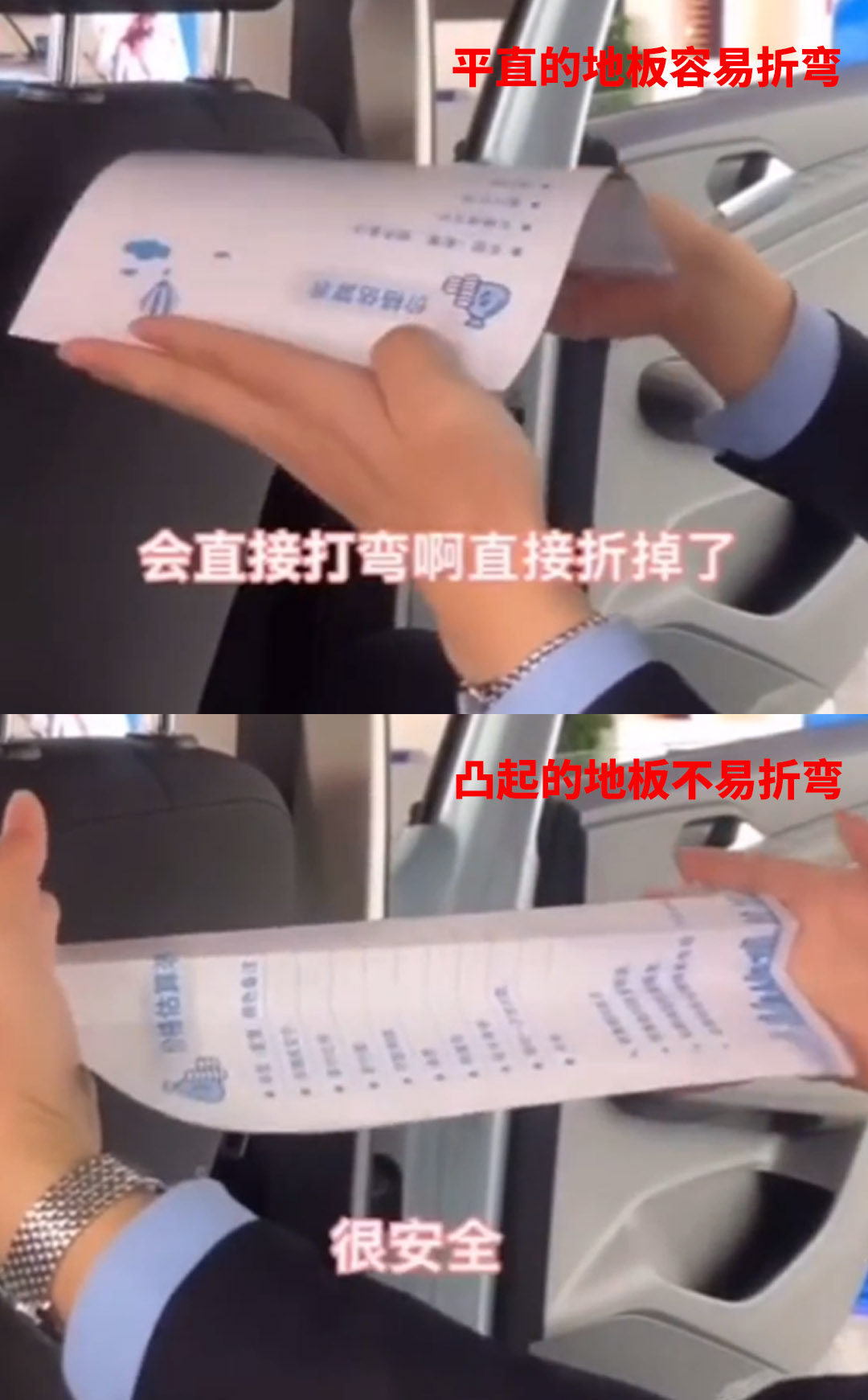 为了找到原因,买买君翻阅了大量资料,最终在万能的“抖音”找到了答案,来自一汽-大众4S店的一位"资深"销售用一张普通的A4纸向大家演示了大众为什么凸起如此之高。因为折叠之后不容易弯折,撞击后更安全,而平整的地板在撞击后更容易弯折。