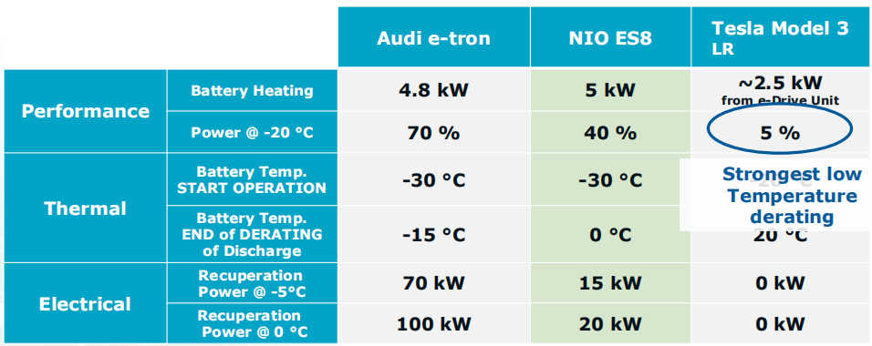 冬天因为电解液的粘度变高,电池的充放电性能都会大幅降低,有多夸张呢?零下20度,奥迪 E-tron最大输出功率只有70%,特斯拉Model 3只有 5%,你没看错就是5%。北方的老铁吐槽说电动车在北方根本没法用,没毛病!