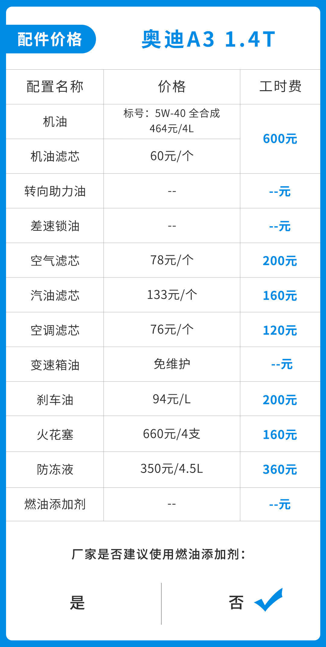 根据奥迪A3车型保养手册上的数据来看,每次保养必做的机油机滤更换工时费就高达600元,很多同级别的丰田、本田车型一次小保养都未必要花费600元,这种高昂的工时费确实让人体会了一把什么叫豪车的体验。