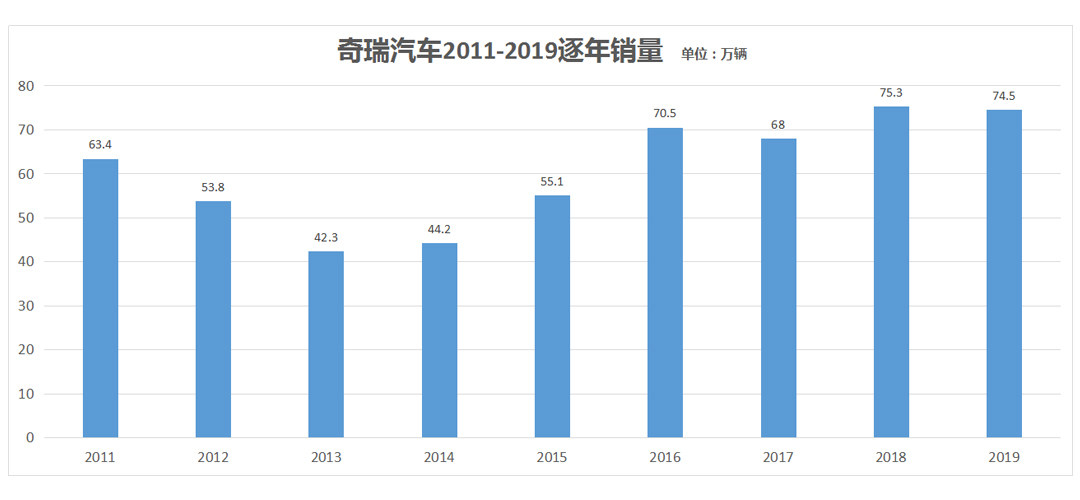 在2013年前,奇瑞汽车的整体销量位居国产汽车品牌的榜首,作为当时国产汽车品牌中的销量冠军,在近几年的表现好像却不太行。以2019年为例,奇瑞汽车销量仅有74.5万辆,而吉利汽车销量为136.1万辆,长安汽车175.9万辆,对比现如今大热门的长安与吉利,奇瑞汽车连长安一半的销量都没有。当年国产品牌中的销量No.1,怎么如今却“硬”不起来了呢?