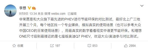 从李想发布的微博来看,他表示:很愿意和大众旗下最先进的PHEV车型来一次节能环保测试,通过模拟真实的使用环境,用最真实的数字来比一比现实中谁更节能环保。