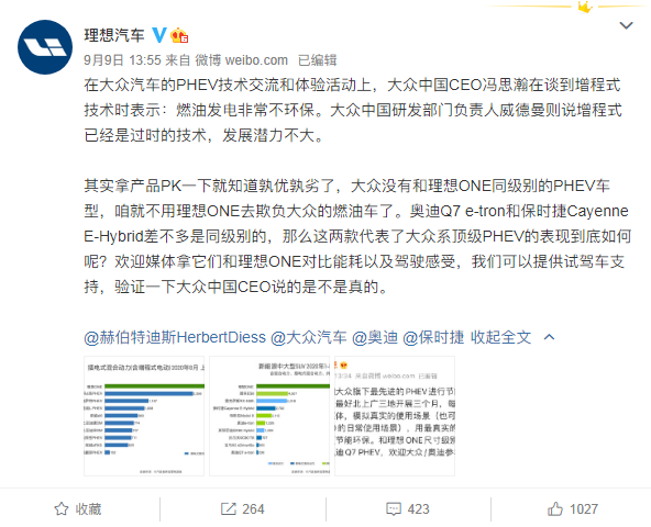 理想汽车官方微博也进行了回应,表示:“拿产品PK一下就知道孰优孰劣;愿意支持试驾车,由专业媒体进行能耗和驾驶感受测评,验证大众中国CEO说法是否准确。