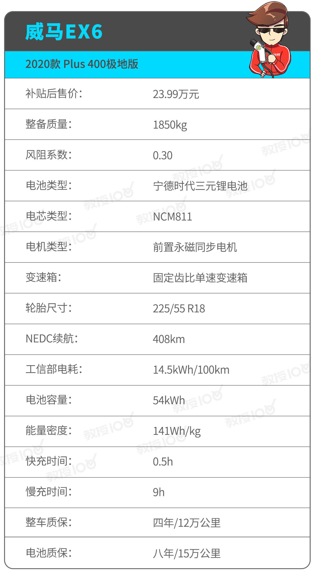 见惯了新推出的纯电动车动辄600km以上的NEDC续航里程,或许你对威马EX6 Plus 400仅有的408km续航里程有点看不上眼。需要清楚的一点是,威马EX6 Plus 400的电池容量仅有54kWh,而600km续航车型的电池容量一般在70kWh以上。