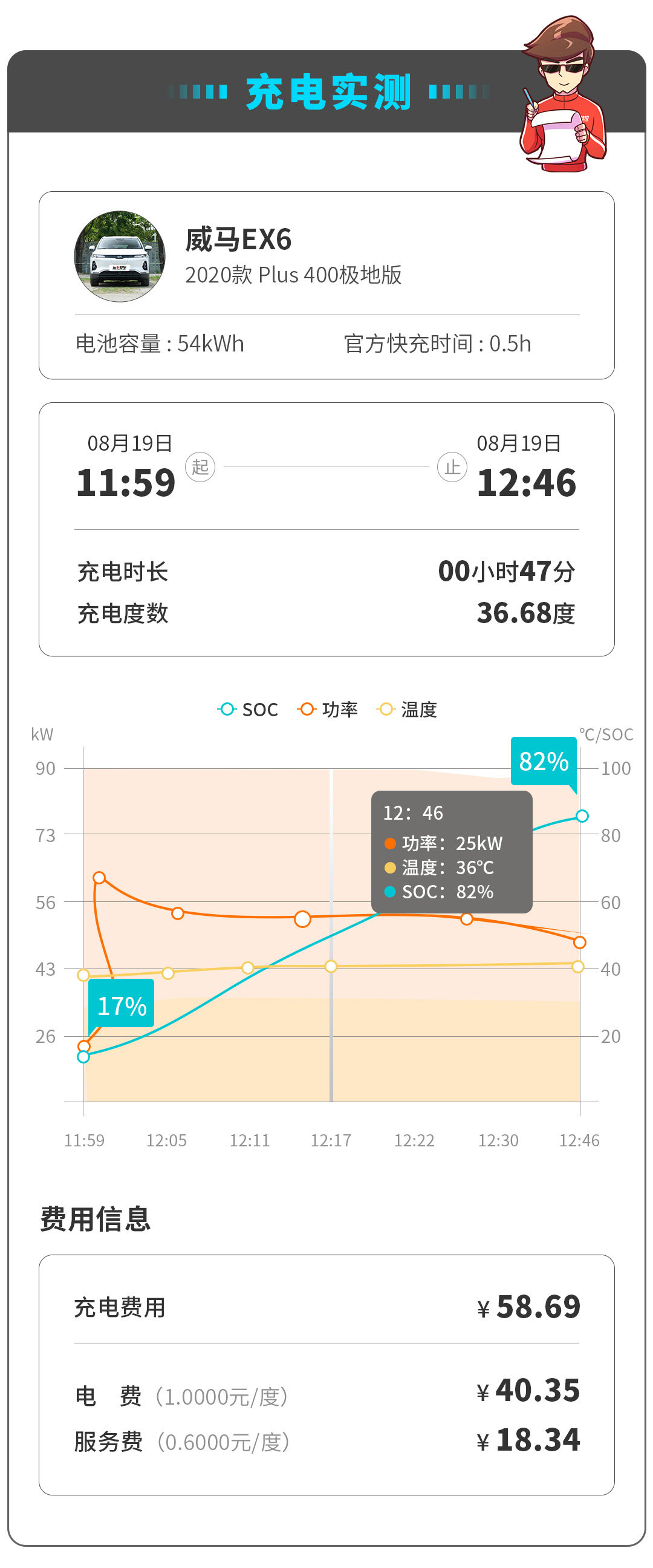 从数据来看,威马EX6的充电功率一开始会飙升到70kW左右,SOC达到30%左右功率开始下降,SOC达到80%左右功率已经下降到30kW的水平,此时快充充电已经非常慢了。