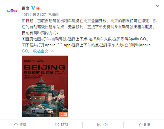 10月10日,百度Apollo GO无人车正式登陆北京,开放的Robotaxi测试区域总长度约700公里,覆盖亦庄、海淀和顺义三个区域生活圈和商业圈等近百个站点。