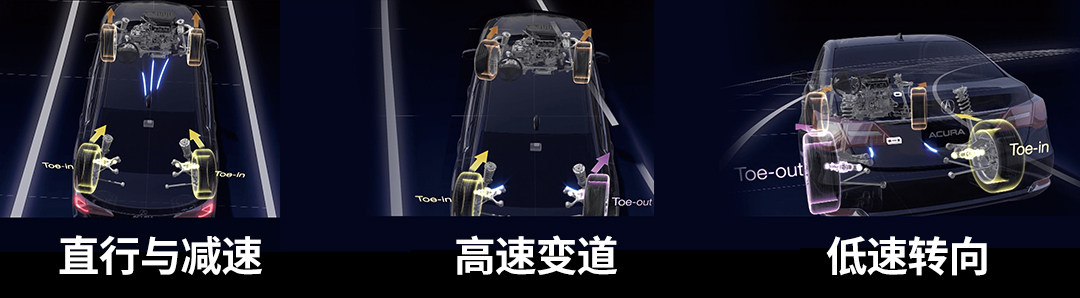 为了解决前驱车转向不足的问题,讴歌给出了自己的答案——PAWS。PAWS全称 Precision All Wheel Steer 全轮精准指向技术,这一系统能够通过电机调整后轮的前束角角度。在紧急制动和高速行驶的时候,PAWS让两个后轮呈现内八的姿态,增强直进性。在低速转弯时,后轮的角度与前轮转向角呈相反的方向,减少转向不足的影响。在高速变向时,后轮角度与前轮转向角呈相同的方向,提升高速稳定性。