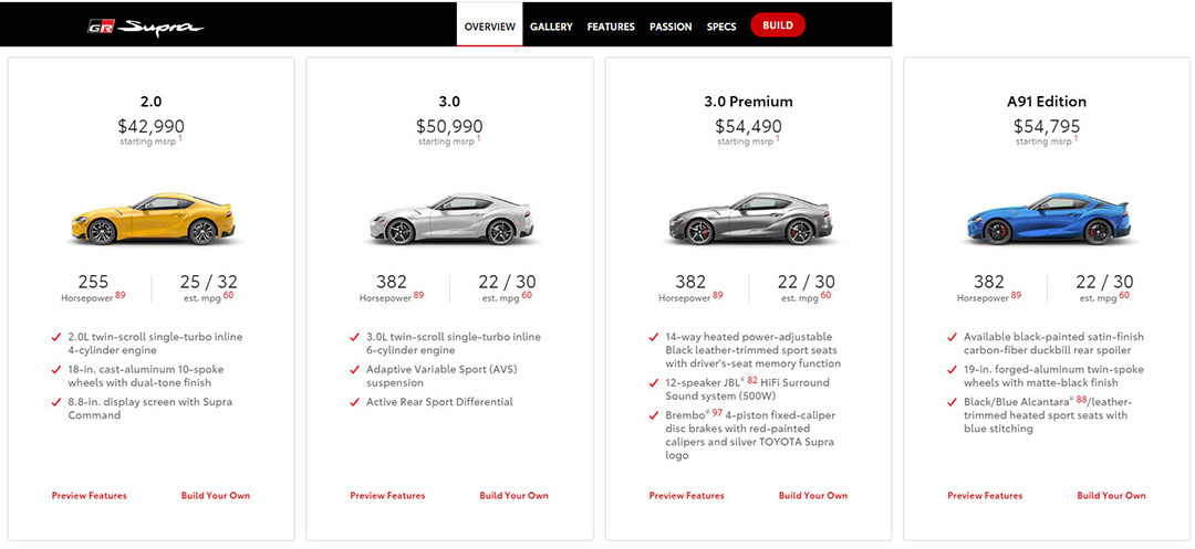 此时我们再了解下丰田SUPRA在美国最新的市场行情,2.0T版配备18英寸轮圈,价格是4.299万美元,3.0T配运动套件+自适应悬架是5.099万元美元,在不少经销商中价格美丽程度远高国内市场。在一波热情高涨的推进下,国内2.0T售价超过60万确实只能让有JDM情怀的用户早买早享受。