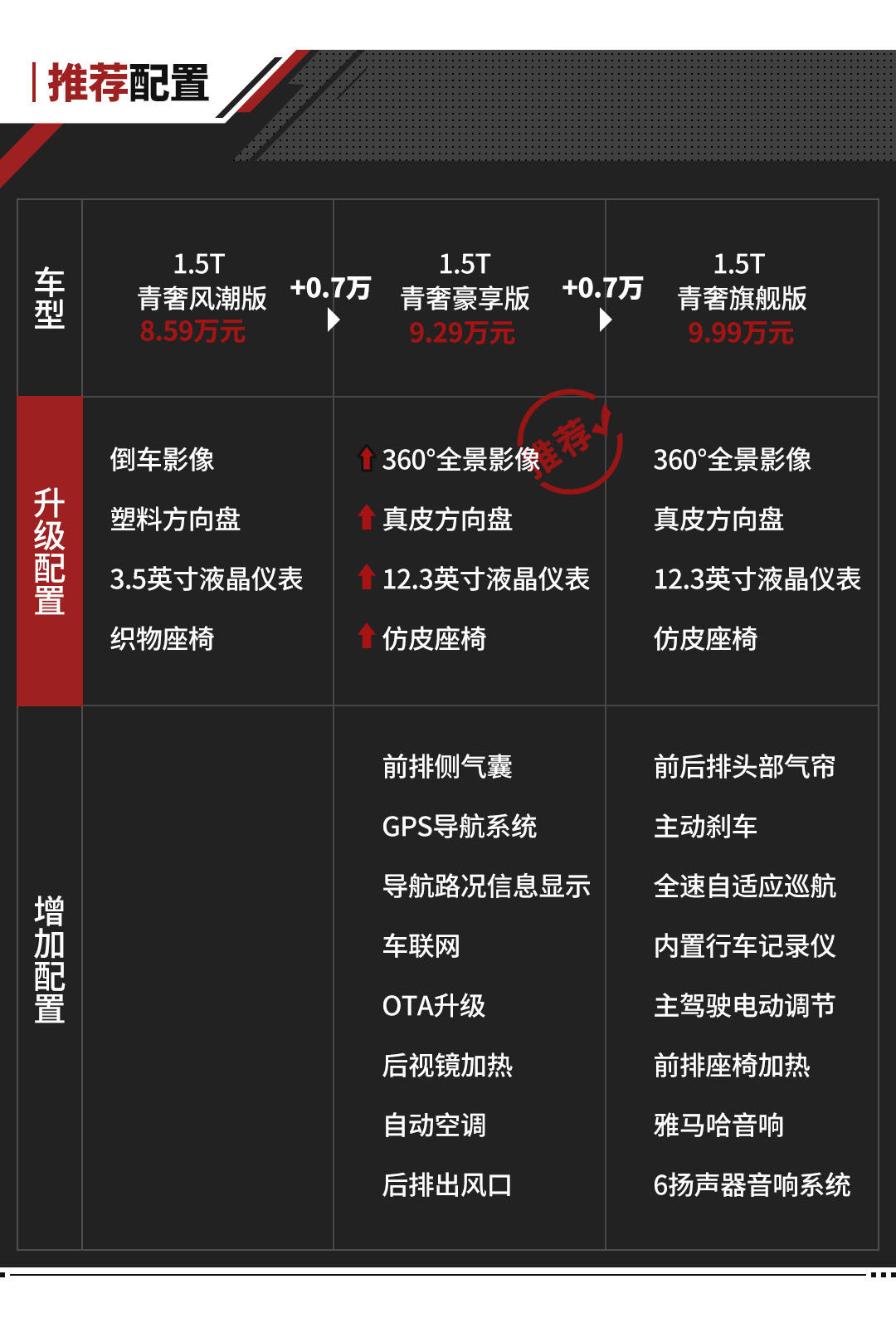 综合来看,9.29万元的1.5T青春豪享版是一个比较适中选择,因此我们三家店都是以这个配置作为购车咨询;如遇预算充足,9.99万元的旗舰版在驾驶辅助和其他舒适性、便利性配置方面,优势更加明显一些,限定版则不在考虑范围之内。