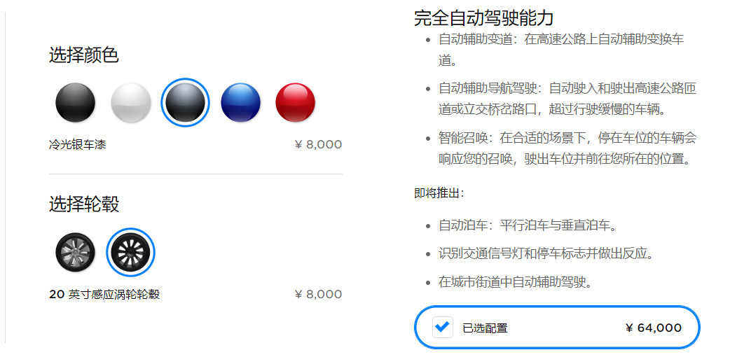 选装方面:8000元升级20寸轮毂,除黑色之外所有颜色都需要加8000元,家庭充电桩8000元,6.4万升级完全自动驾驶。