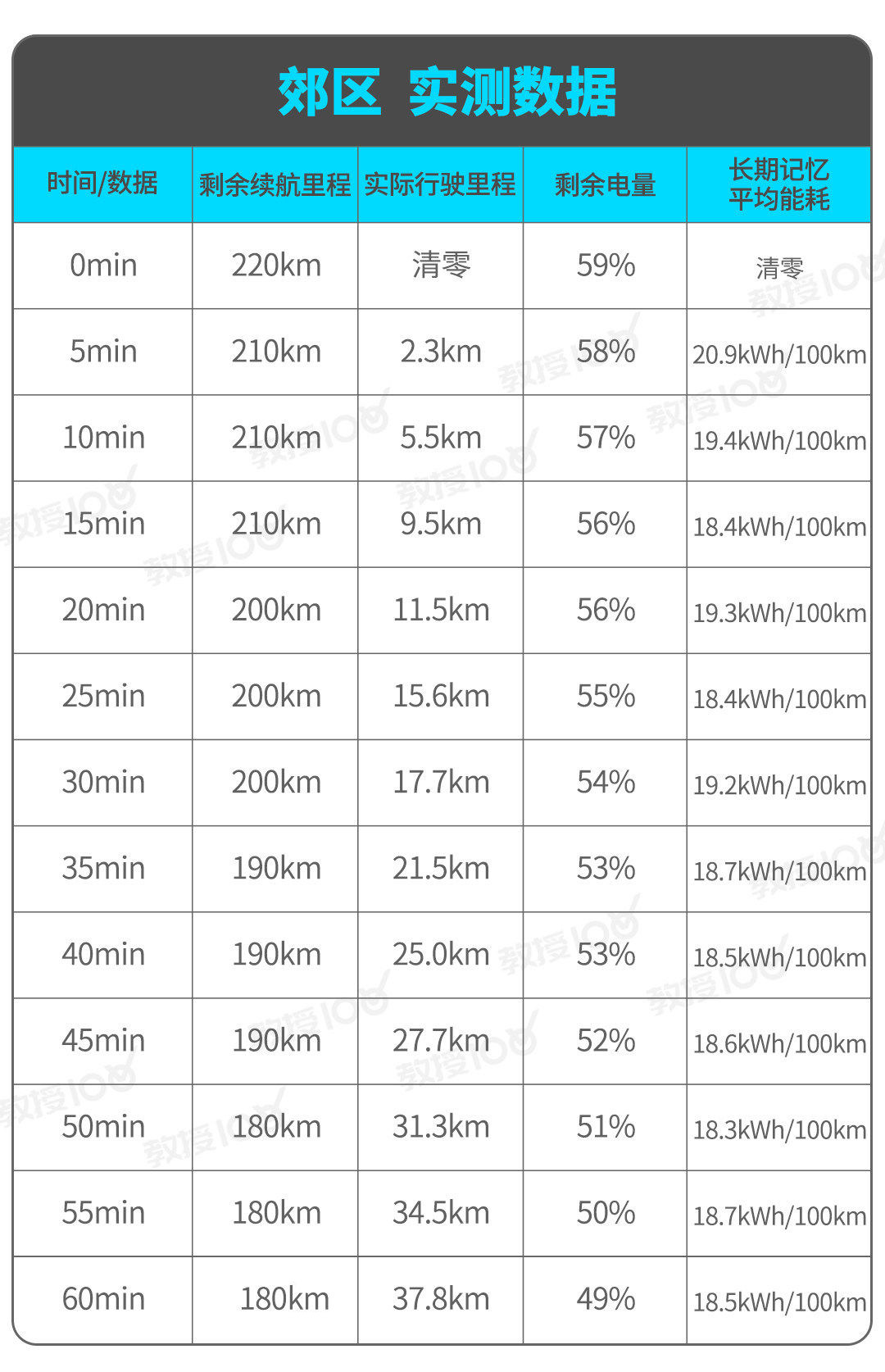 回到电耗测试本身,经过实测,以60-70km/h时速在郊区行驶一小时,平均电耗是18.9kWh/100km,和其早高峰期间的电耗水平相比是旗鼓相当。按照工业用电1.6元/度电计算,平均每公里电耗花费也是0.30元。