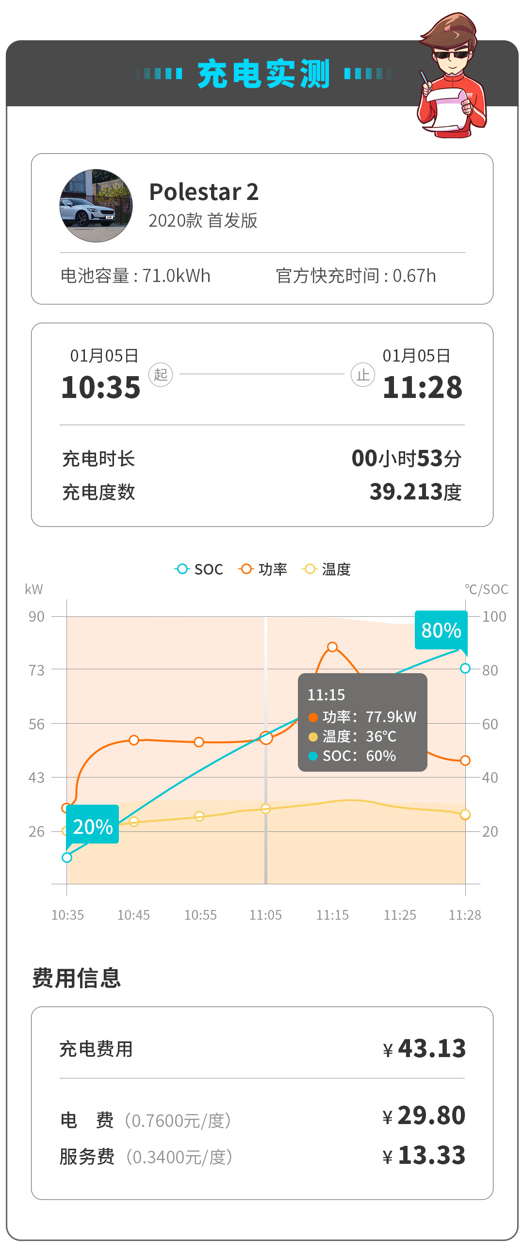 虽然电池容量不大,但官方显示快充(30-80%)需要四十分钟左右的时间,补一次电的价格大概是39元。而从教授的实际测试来看,极星2官方还是挺实诚的,实测20%-80%需要53min,花费是43元左右。