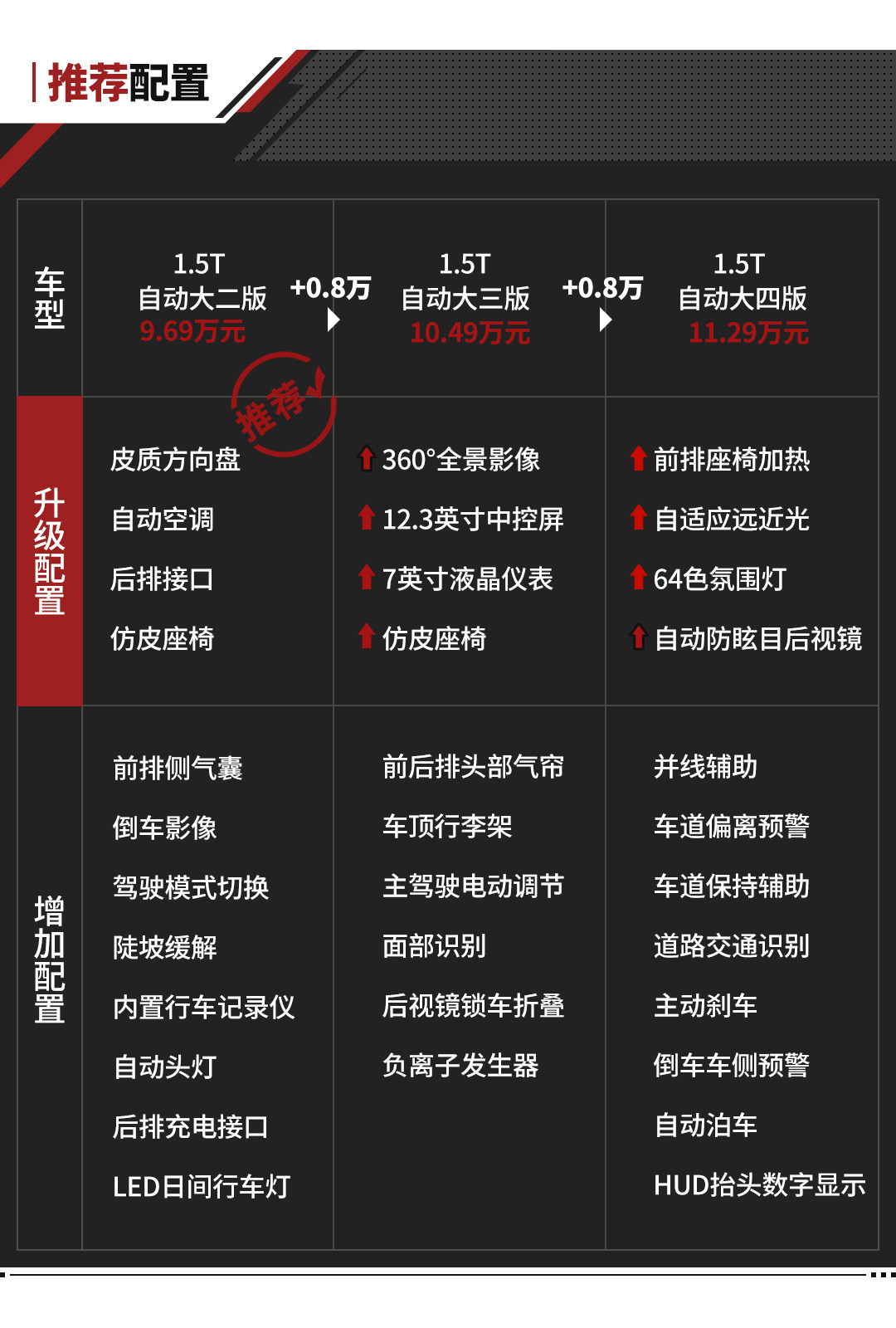 手动挡基本上就看个人需求了,而自动挡车型一共有大一到大四个配置。大一版配置较少暂不考虑,我们对比其它配置之间的差异和价格,最终选定了9.69万元的大二版。当然预算还能再充沛一些的消费者更加推荐大四版,其主要优势集中在自动驾驶功能方面。