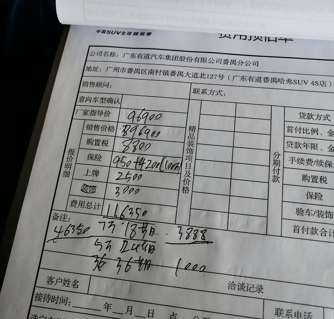 在选定了版本,和销售简单沟通了一些关于购车的细项之后,销售给了我们报价单。