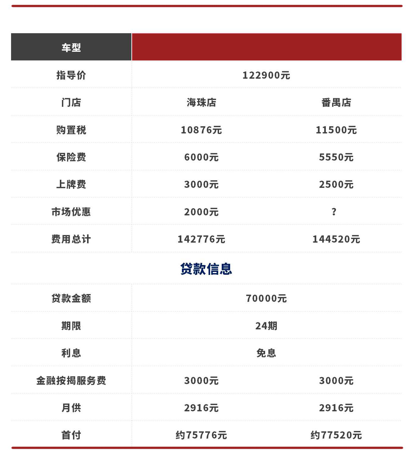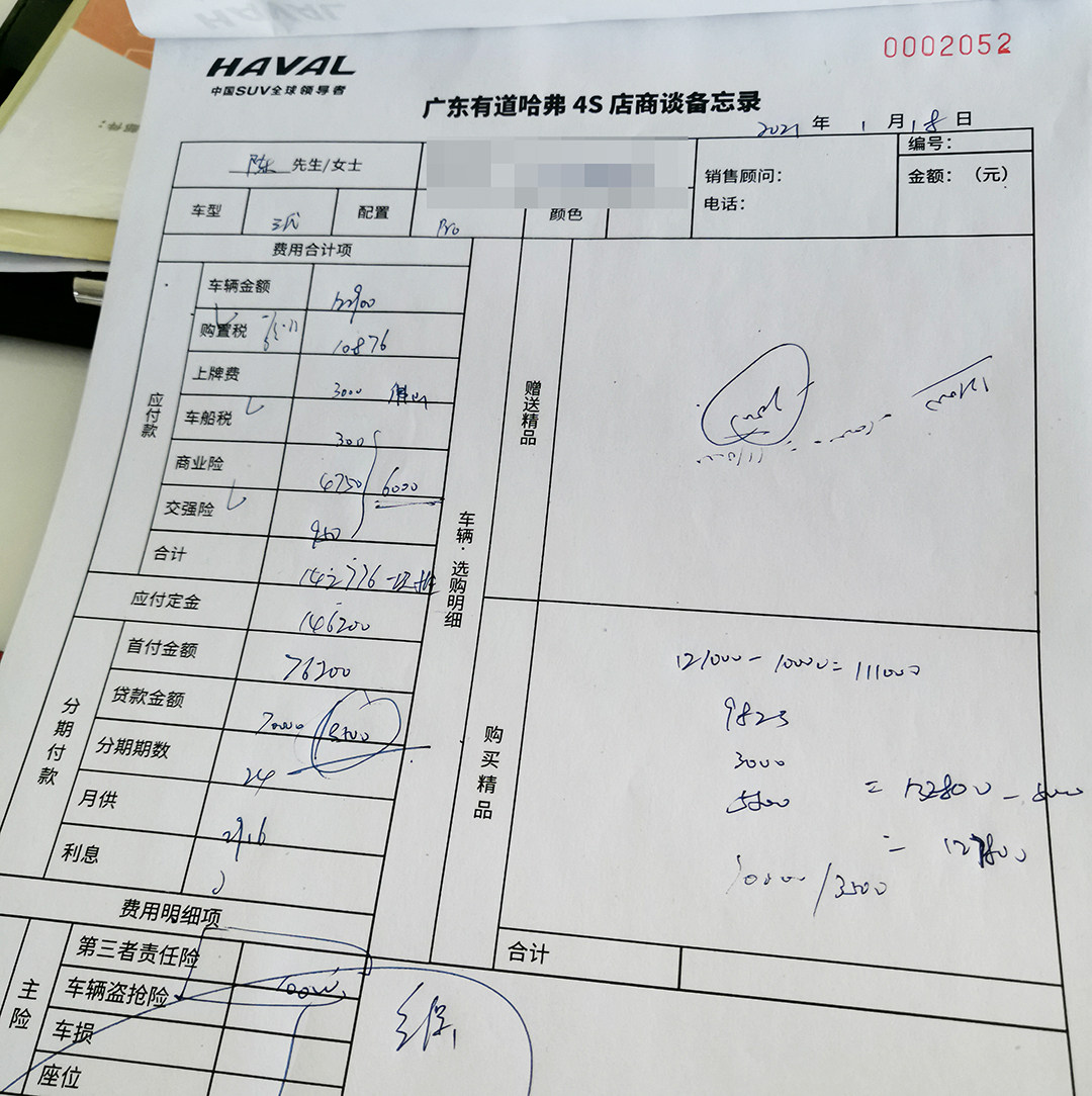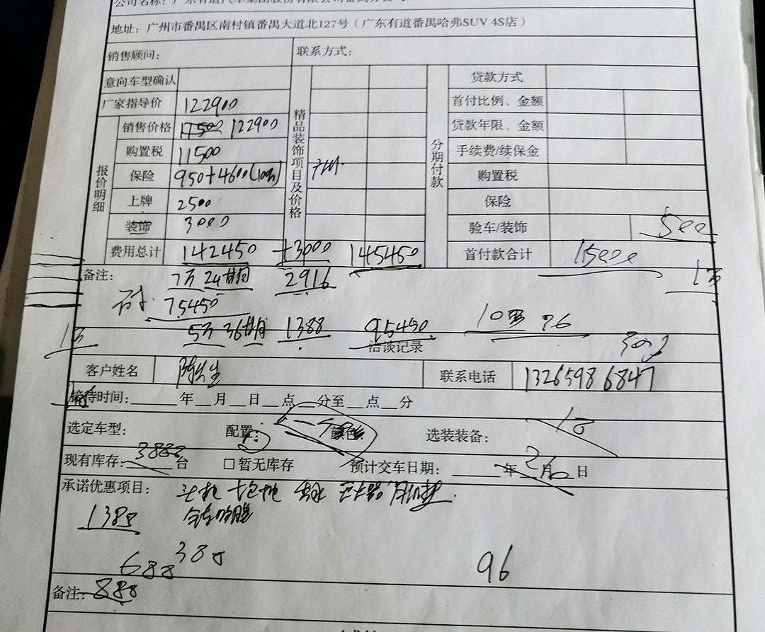关于上牌方面,因为没有广州指标的原因,我们选择周边城市佛山牌;关于贷款方面,均选择厂家提供的7万24期的免息贷款。与销售做了一些简单的沟通后,销售给出了我们报价单。