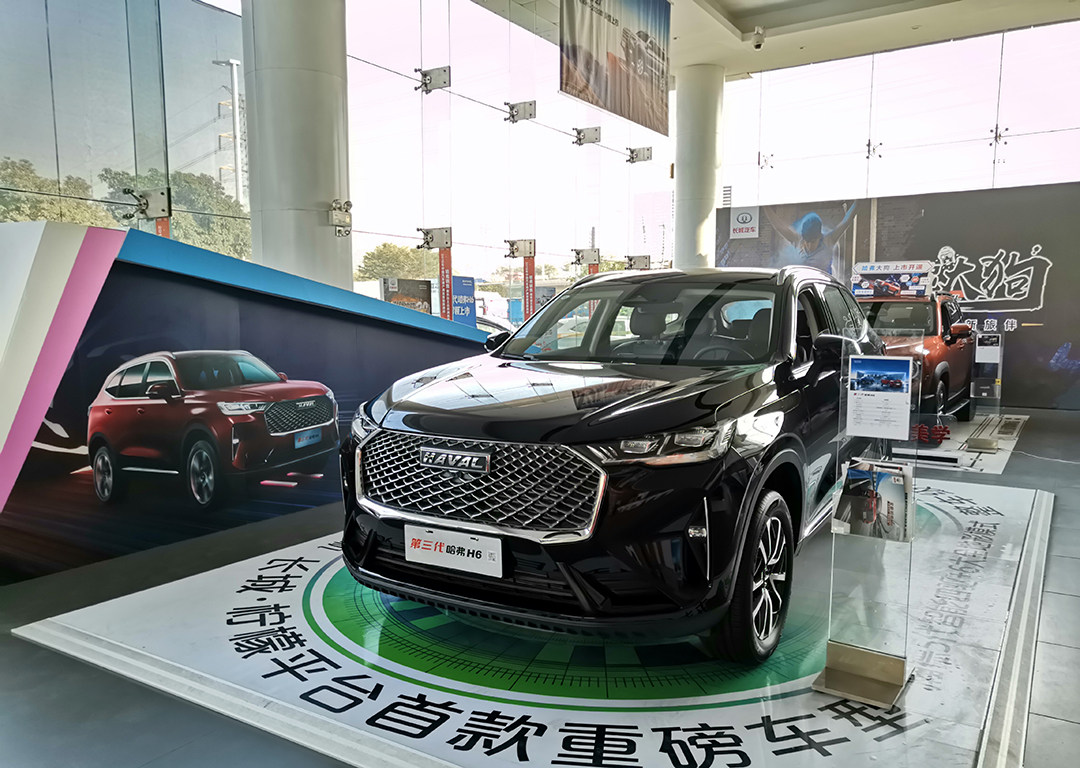 第三代哈弗H6作为门面车型,一般都是摆在店内最显眼的位置,甚至为了凸显其尊贵的气息,引擎盖位置还放上了红色的饰条,前面也打出了“新世代全球智慧座驾”的标语。