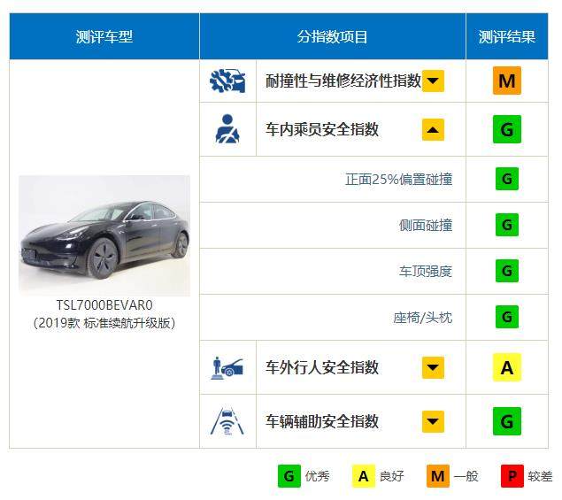 特斯拉Model 3获得了2个G、一个M、一个A的优秀成绩,碰撞发生时,车内人员保护得较好,正面、侧面碰撞都能获得优秀(G)表现。