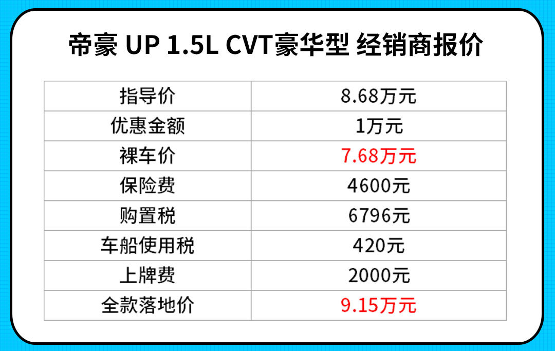 随后我们让销售人员做了一个1.5L CVT豪华型的报价:官方售价8.68万,现金优惠1万元,购置税6796元,上牌费2000元,保险费4600元,全款落地9.15万元。