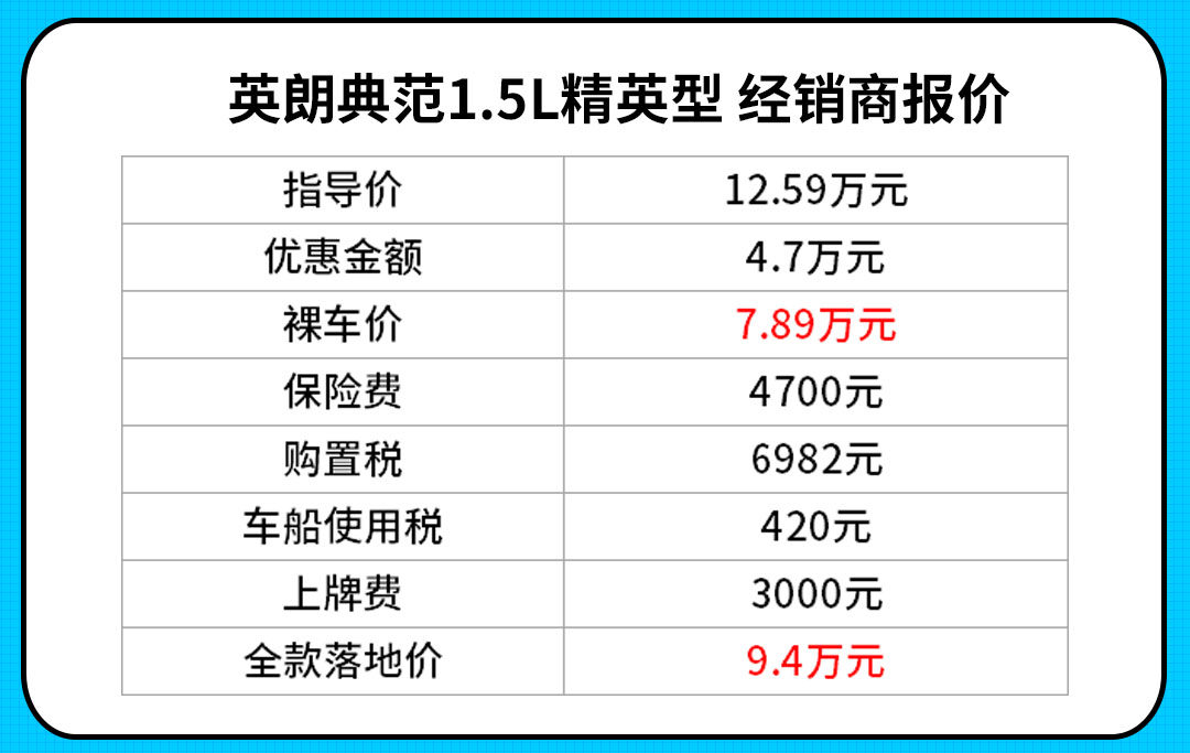 目前英朗典范1.5L精英型现金优惠4.7万元,裸车价7.89万元,加上购置税、保险、上牌等花费,全款落地价9.3万元。而另据销售人员介绍,如果诚心购买,还能在报价的基础上便宜2000-3000元左右,最低落地价只要9.1万元左右。