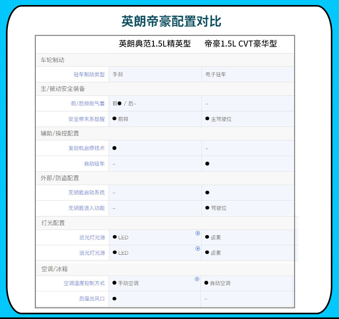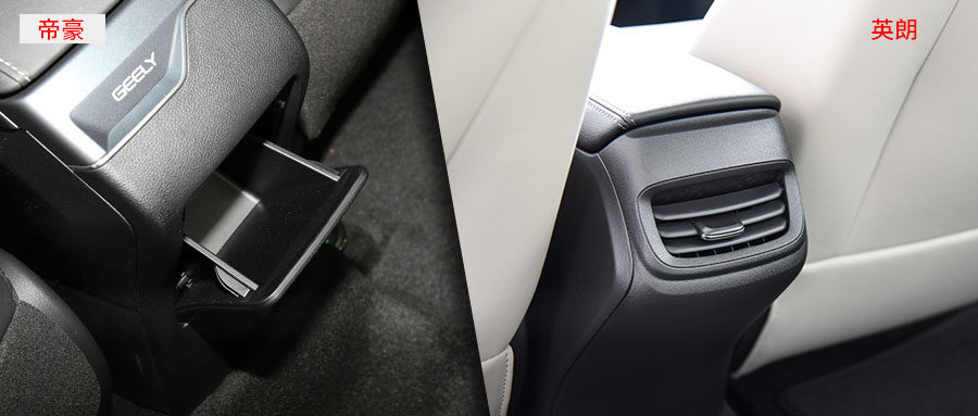相对来说,帝豪比英朗多了无钥匙启动/进入、后排杯架、自动空调、电子手刹等;但英朗比帝豪多了发动机启停、LED大灯、后排空调出风口等,并且英朗的车机系统支持OTA升级和CarPlay/CarLife。