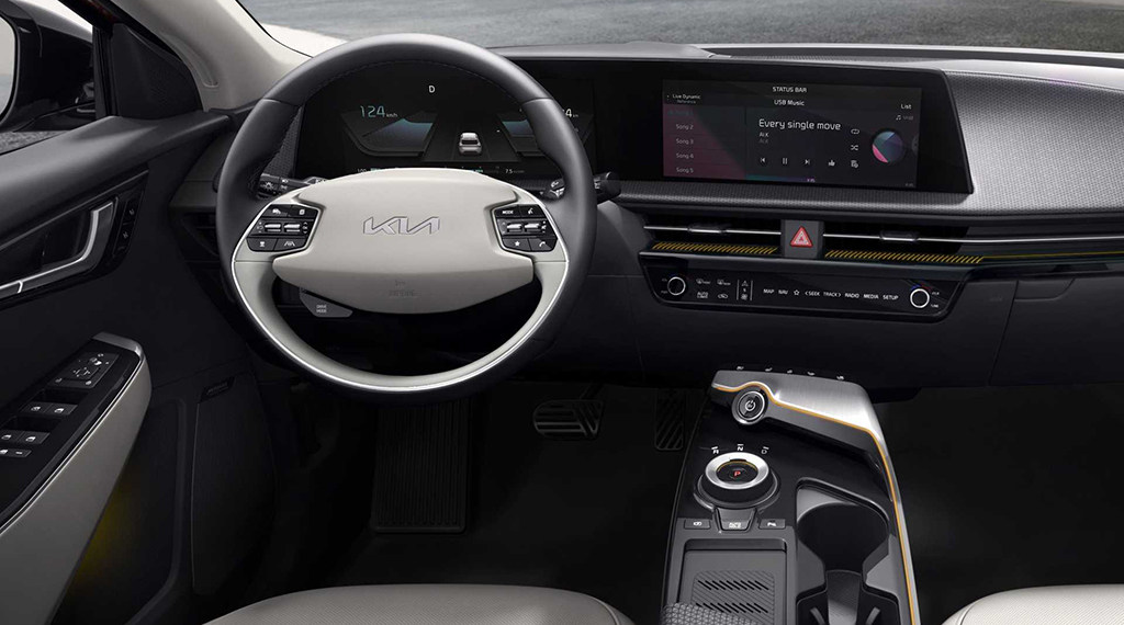 并且起亚EV6还采用了并不传统的双辐式方向盘,以及电子旋钮换挡机构,让其内饰保持简洁的同时,也增强了一丝科技感。
